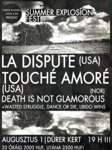Hol: Szabad az Á | mikor: 18:30 | mennyiért: 2000/2500 Ft | kikkel: Touché Amoré, Death Is Not Glamorous, Wasted Struggle, Dance or Die, Libido Wins | kiktől: Tukker & Döme & Ádám | @ Facebook