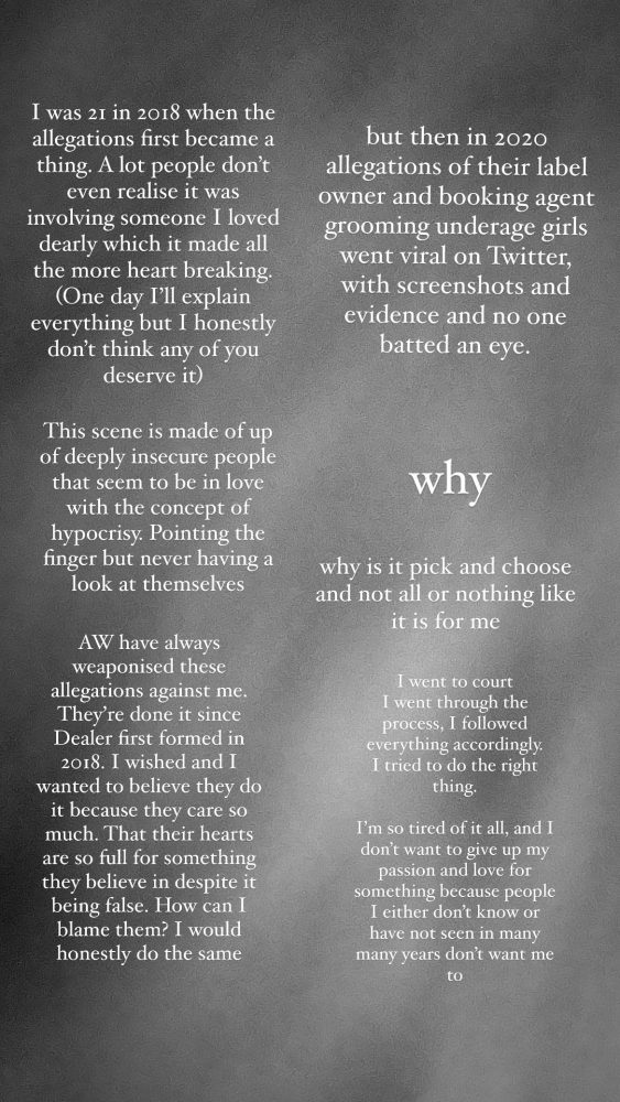 Az egész még 2018-ra nyúlik vissza, akkor érkeztek az első vádak Aidan ellen (szerinte egy olyan embertől ráadásul, akit nagyon szeretett, így még fájóbb volt az egész), aminek következtében ki is rakták korábbi zenakarából, az Alpha Wolfból, ahova a helyére a mostani énekes, Lochie Keogh érkezett, Aidan pedig megalapította a Dealert. Bár úgy tűnhetett, hogy rendeződtek a viszonyok (na, nem a két zenekar közt), a Dealerből kétszer is kilépett majdnem az összes zenész különböző okokra hivatkozva (egy nagyon rövid ideig még a harmedos Tóth Gábor is tag volt), egy időre földbe is állt a zenekar, és 2023 elején aktivizálódott újra, és idén májusban hozta ki első lemezét New Order of Mind címmel.