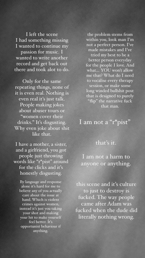 Holmes állítása szerint az Alpha Wolf és kiadója, a Greyscale Records a kezdetek óta uszít ellene és a zenekara ellen, átfogó lejárató kampánnyal próbálják ellehetetleníteni, miközben ezzel is állítólag a kiadó fejeséről, Ash Hullról terelik el a közbeszédet, akit 2020-ban szintén többen megvádoltak azzal, hogy fiatalkorú lányokat próbált szexuálisan kihasználni. Aidan instagramos sztorijaiból az is kiderül, hogy állítólag az Alpha Wolf basszere, John Arnold (aki egyébként az elsők közt szólalt fel a mostani Attila-turné bejelentésekor és nemierőszakolózta le az összes részvevőt) is nagy kéretlen faszképküldő hírében állt anno 2016 környékén.