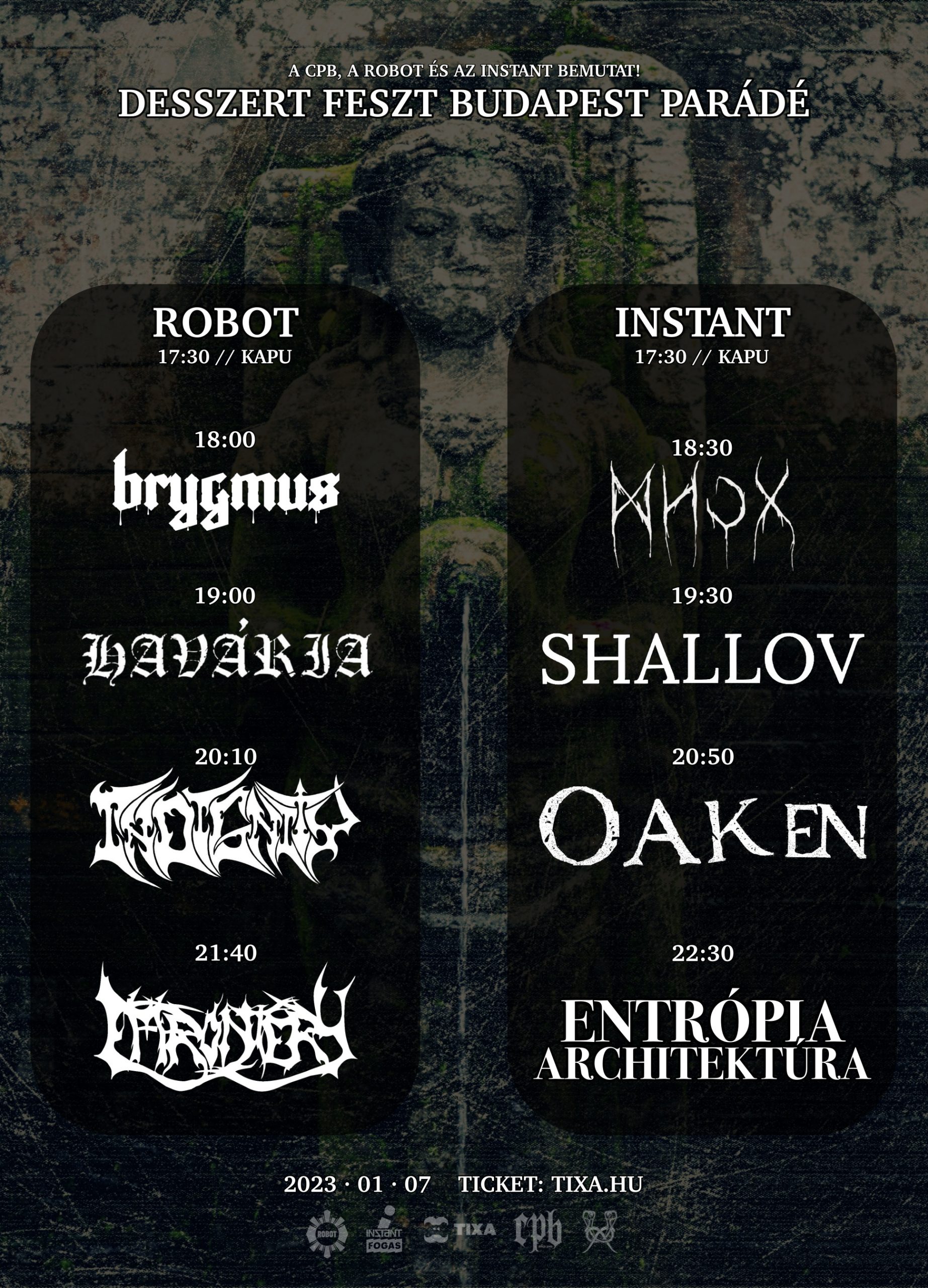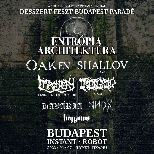 A Komplexumban fog debütálni az Entrópia Architektúra új felállása. Lesz új Havária-dal (Utolsó háború), új lemezét mutatja be az Effrontery, akik lengyel barátaikat, az Indignityt is magukkal hozzák. Ha ennyi nem lenne elég, velünk nyitja az évet a pozsonyi Shallov, az Oaken, a Boru és a Brygmus.Az este menetrendje pedig így alakul: