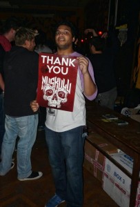Misha vagyok, a Periphery-ben gitározom… mondjak pár szót a többiekről is? Még két gitárosunk van, rajtam kívül ugye, az egyikük neve Mark Holcomb, a másikat Jake Bowennek hívják. Végre találtunk állandó bőgőst is, aki egy jó barátunk, Nolly. Egyébként Adam Getgood a neve, de mi csak Nolly-nak hívjuk. Matt Halpern a dobosunk, ő sajnos nem lehet itt, mert kificamította a vállát, szóval most a Chimp Spannerös Boris Le Gal ugrott be a helyére. Az énekesünk pedig Spencer Sotelo.