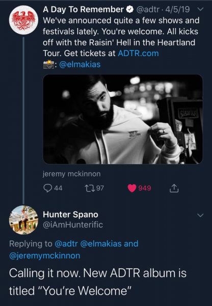 Az egyik koncert előtt felöltöztem, és arra gondoltam, kéne még rám egy fehér pulcsi. Szóval bementem egy boltba és vettem egy fehér pulcsit, amire pirossal rá volt írva, hogy "you're welcome" pirossal, és pont olyan színű cipő volt rajtam. Gondoltam, ez pont tökéletes lesz. Készült rólam egy fotó ezen a mexikói fesztiválon, amin megfogom a pulcsimat a "you're welcome" feliratnál. Másnap megtageltek a képen, és az első komment az volt, hogy "Most megmondom, az új A Day to Remember-album címe You're Welcome." És mivel a neten olvastam ezt, teljesen gyanútlanul, eléggé beütött, hogy valaki megmondta, mi legyen egy ADTR-lemez címe. Lefagytam, ott ültem, és azt éreztem, hogy "hát ez kurva jó." Szóval egy rajongótól jött a cím.