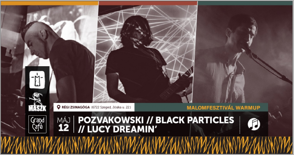 Az itthon egyedülálló noise rock-alapvetés Pozvakowski és a legjobb tavalyi nagylemezek listáján harmadik helyre feltörő poszt-metalos Black Particles mellett a helyi Lucy Dreamin' erősíti az estét, akik hangulatos pszichedelikus rock zenével melegítenek. Az pedig, hogy ezeket a zenekarokat élőben egy zsinagógában hallhatjuk, egy olyan koncert ígéretével kecsegtet, amit kár lenne kihagyni.
